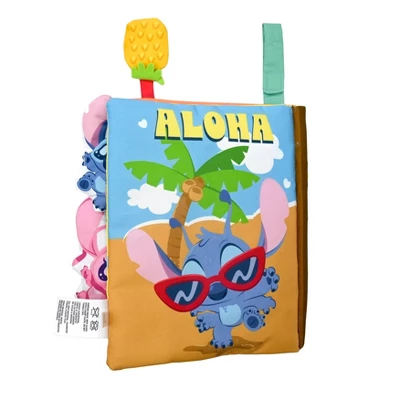 This deluxe soft book features removable plush Stitch and Angel toys, peek-a-boo flaps, slider piece, crinkle and tactile accents. Made for ages 0+ and measures 6” x 8”.