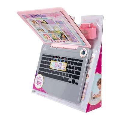 Sleek, chic and oh so fun, this modern Disney Princess Style Collection Play Click & Swap Laptop provides an engaging, realistic and fun play experience. With five different modes of play, you’ll have so much fun pretending to “email”, “chat” and “shop” your favorite Disney Princesses! Each button on the keyboard independently clicks providing a realistic play experience in free play mode, while the remaining four modes are determined by the “F key” icons and include music, shopping, email and video chat! The two included double-sided screen cards match the play modes and can be switched in and out for endless fun. “Smart” phrases and sound effects will also keep you connected with favorite Disney Princesses! Decorate your laptop with the stickers provided and wear the play “wireless” ear buds to show off your modern high tech look! Yes